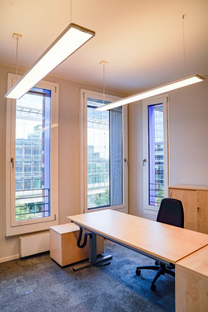 Insgesamt wurden 3.600 Leuchten durch moderne, energieeffiziente LED-Lichttechnik ersetzt. Dadurch konnten die Beleuchtungsstärken optimiert und eine gleichmäßige, blendfreie Ausleuchtung der Arbeitsbereiche realisiert werden. Ergänzt wurde das neue Beleuchtungssystem durch eine intelligente Lichtsteuerung, die sich flexibel an Tageslicht und Nutzung anpasst.